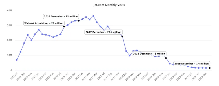 Some might argue this decision to kill Jet.com was already made when Walmart effectively absorbed the remaining Jet.com staff into new roles at Walmart as reported by the Wall Street Journal in June of 2019. I would argue the decision was made much earlier—in 2017—when monthly traffic to Jet plummeted and never reversed course. (See graph below from MarketplacePulse.)